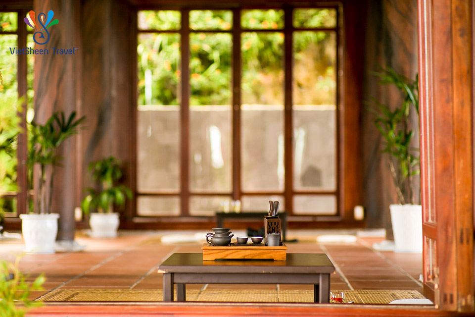 Du khách thưởng thức tách trà trong Trú Vũ Trà Quán trong không gian tĩnh lặng của chốn bồng lai, sự kết hợp độc đáo giữa kiến trúc, âm nhạc, và trà đạo tạo nên một sắc cảnh tựa như cư sỉ ẩn cư mang đến sự thanh tịnh cho tâm hồn.